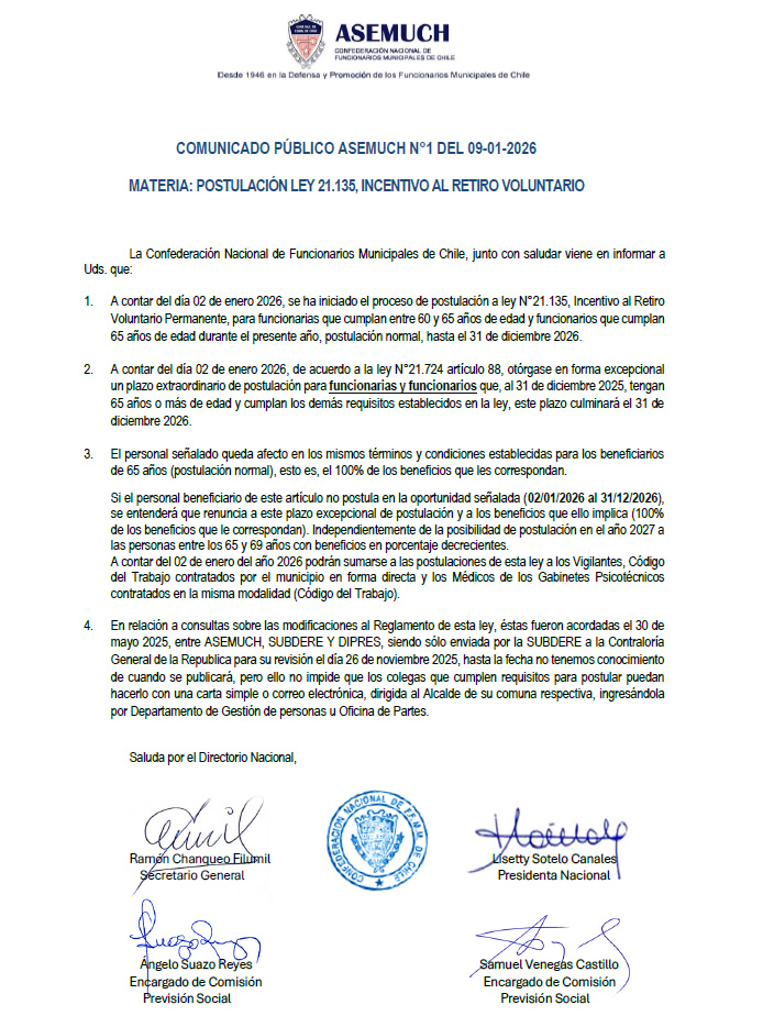 Comunicado Público ASEMUCH N°1 del 09-01-2026 Ene 11, 2026 | Comunicados, Noticias Destacadas Comunicado público ASEMUCH N°1 de fecha 09 de enero de 2026, relativo a POSTULACIÓN LEY 21.135, INCENTIVO AL RETIRO Descargar comunicado: Comunicado Público Asemuch N°1 09-01-2026